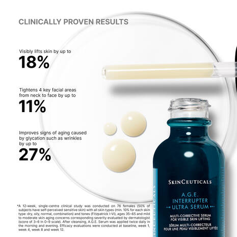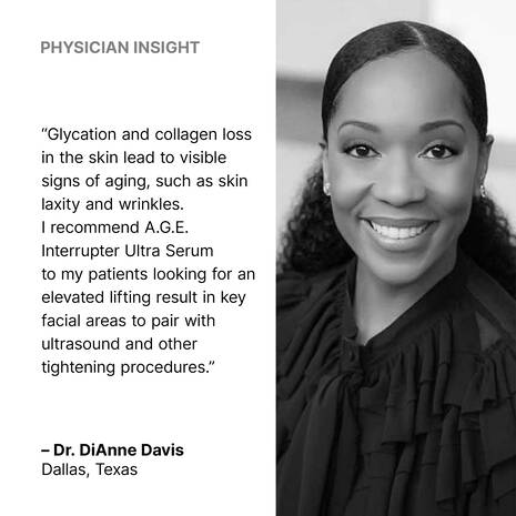 A multi-patented skin lifting serum that increases collagens in all layers of the skin to visibly rejuvenate and tighten 4 key areas, including neck, jaw line, cheeks and forehead, for a more visibly sculpted appearance. This skin tightening serum formula contains a high concentration of 34.6% Flavo-Proxylane to help visibly reduce signs of aging impacted by collagen decline and glycation, including wrinkles, and loss of firmness. A.G.E. Interrupter Ultra Serum is also formulated with synergistic ingredients Rhamnose and Gentiana Lutea Root Extract to help maximize lifting and facial sculpting results. Tested on all skin types and tones.